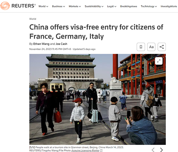 路透社報(bào)道稱,中國(guó)外交部宣布,2023年12月1日至2024年11月30日期間,上述國(guó)家持普通護(hù)照人員來(lái)華經(jīng)商、旅游觀光、探親訪友和過境不超過15天,可免辦簽證入境。