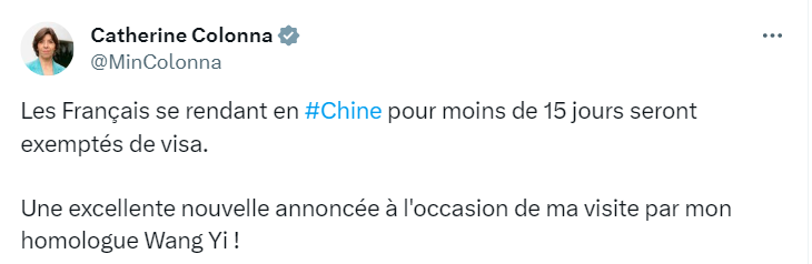 法國(guó)外長(zhǎng)科隆納也表示:“我的同事王毅在我訪問之際宣布了一個(gè)很棒的消息!前往中國(guó)停留不超過15天的法國(guó)人將免簽。”