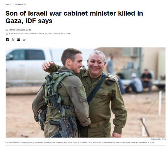 中新網(wǎng)12月8日電 綜合外媒報道,當(dāng)?shù)貢r間7日,以色列國防軍表示,以色列內(nèi)閣部長、前國防軍參謀長加迪·埃曾科特的兒子在加沙地帶北部的戰(zhàn)斗中喪生。