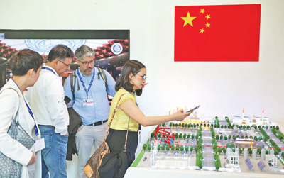COP28舉辦期間,中國碳捕集利用與封存技術受到各方關注。圖為人們在中國角參觀中國首套百萬噸級二氧化碳捕集利用封存項目模型。