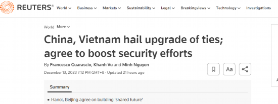路透社12月13日報道稱,中國和越南宣布,兩國簽署了數(shù)十項合作協(xié)議,同意加強安全事務(wù)合作,共同構(gòu)建“命運共同體”。