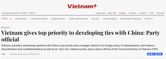 中國日報網(wǎng)12月14日電 12月12日,中國和越南共同宣布中越兩黨兩國關(guān)系新定位,在深化中越全面戰(zhàn)略合作伙伴關(guān)系基礎(chǔ)上,攜手構(gòu)建具有戰(zhàn)略意義的中越命運共同體。國際媒體對中越關(guān)系新定位進行了密集報道,認(rèn)為雙邊關(guān)系更加重要,中越兩黨兩國關(guān)系邁上新臺階。