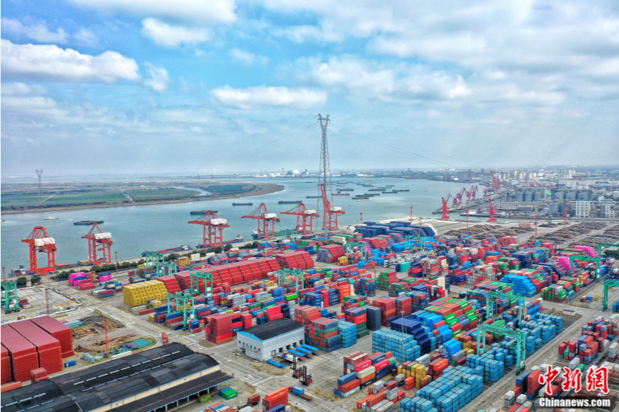 船舶在江蘇省張家港永嘉集裝箱碼頭泊位上裝卸貨物。施柏榮 攝