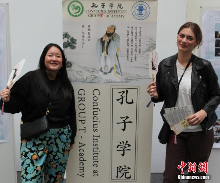 當(dāng)?shù)貢r(shí)間2023年10月19日,比利時(shí)魯汶孔子學(xué)院舉辦“孔子學(xué)院日”活動,魯汶大學(xué)學(xué)子參與活動,體驗(yàn)中華文化。圖為兩名青年體驗(yàn)中國吹墨畫后,揮舞“作品”合影留念。