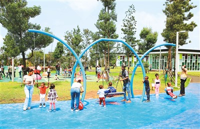 埃塞俄比亞首都亞的斯亞貝巴河岸綠色發(fā)展項(xiàng)目是由中國(guó)援助的工程,包括整治城市河道、在河道周邊修建公園和其他公共設(shè)施等。圖為當(dāng)?shù)睾⒆觽冊(cè)趤喌乃箒嗀惏秃影毒G色發(fā)展項(xiàng)目的兒童樂園玩耍。