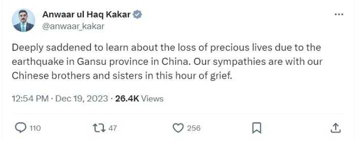 中新網(wǎng)12月19日電 綜合報(bào)道,12月18日,甘肅臨夏州積石山縣發(fā)生6.2級(jí)地震。19日,巴基斯坦總理卡卡爾在社交平臺(tái)上發(fā)帖稱(chēng),對(duì)中國(guó)甘肅省地震中失去的寶貴生命深感悲痛。