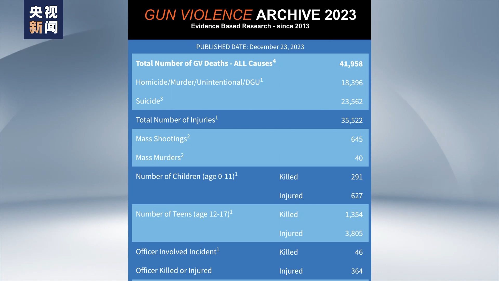 據(jù)美國(guó)“槍支暴力檔案”網(wǎng)站統(tǒng)計(jì),截至12月23日,今年美國(guó)已發(fā)生645起造成除槍手外、至少4人死傷的大規(guī)模槍擊事件,近4.2萬(wàn)人在各類涉槍事件中死亡。(央視新聞客戶端)