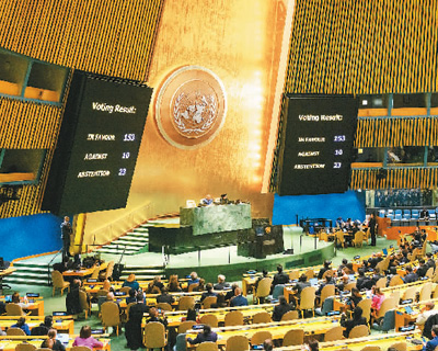 2023年12月12日,聯(lián)合國大會緊急特別會議投票通過決議,要求在加沙地帶立即實現(xiàn)人道主義?;稹D為會議投票現(xiàn)場。