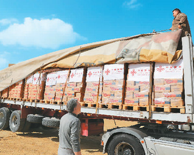 2023年11月27日,在埃及開羅,中國向加沙地帶提供的人道主義物資裝車等待發(fā)運。