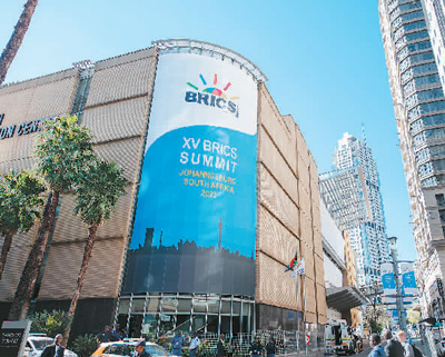 2023年8月23日,金磚國家領(lǐng)導人第十五次會晤在南非約翰內(nèi)斯堡舉行。圖為會場外景。