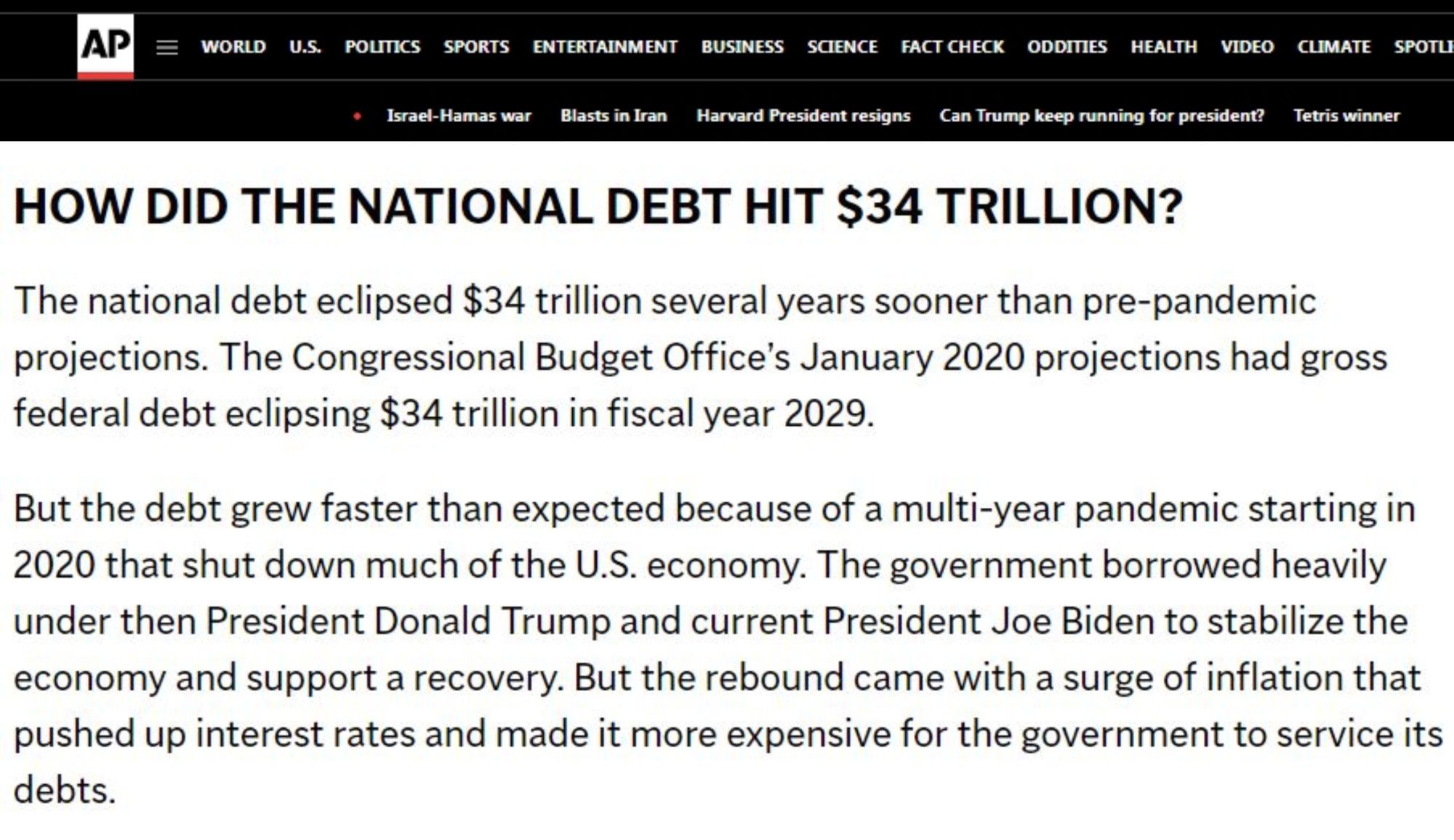 美國(guó)財(cái)政部2日公布的數(shù)據(jù)顯示,美聯(lián)邦債務(wù)總額已突破34萬億美元關(guān)口,再創(chuàng)歷史新高。