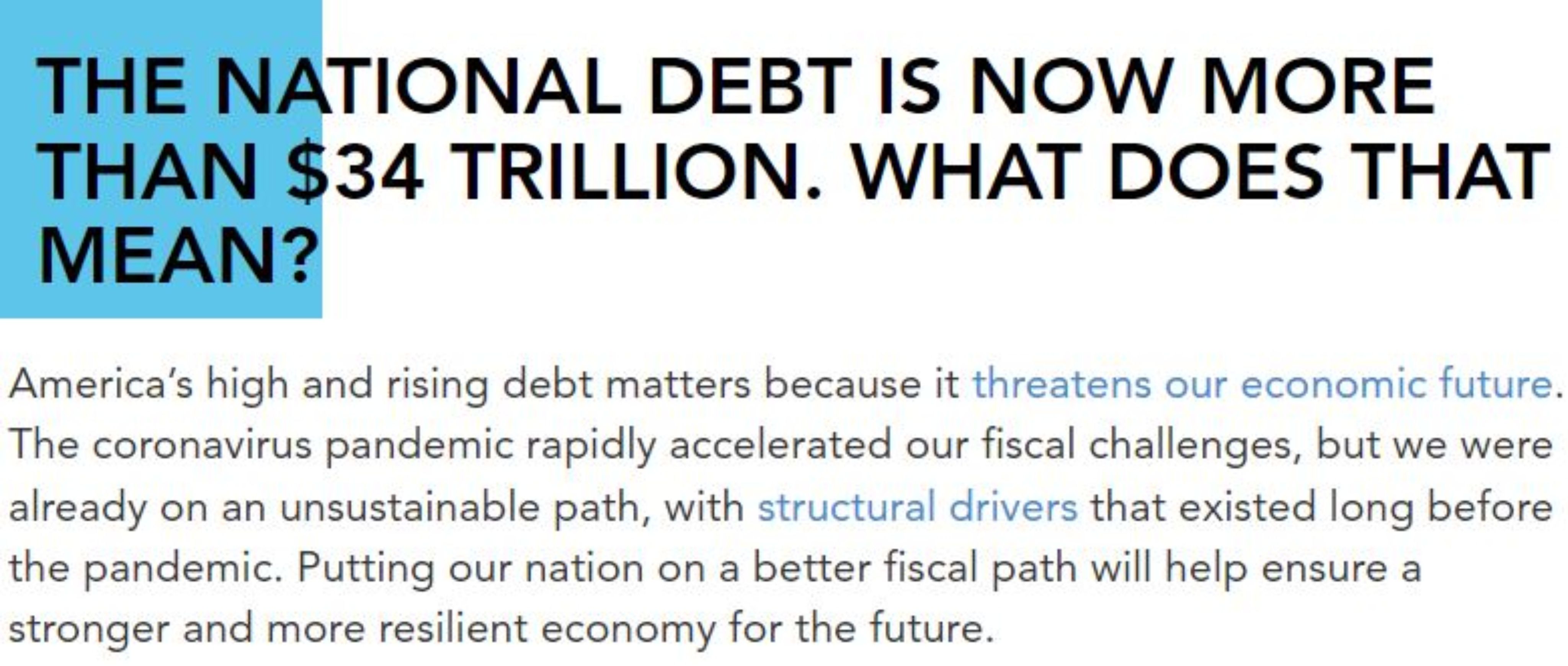 按照美國(guó)獨(dú)立權(quán)威經(jīng)濟(jì)研究智庫(kù)——彼得森基金會(huì)的說法,規(guī)模龐大且不斷增加的債務(wù)“正威脅著美國(guó)的經(jīng)濟(jì)未來”,因?yàn)樵缇痛嬖诘摹敖Y(jié)構(gòu)性驅(qū)動(dòng)因素”已經(jīng)讓美國(guó)財(cái)政政策走上了一條“不可持續(xù)的道路”。