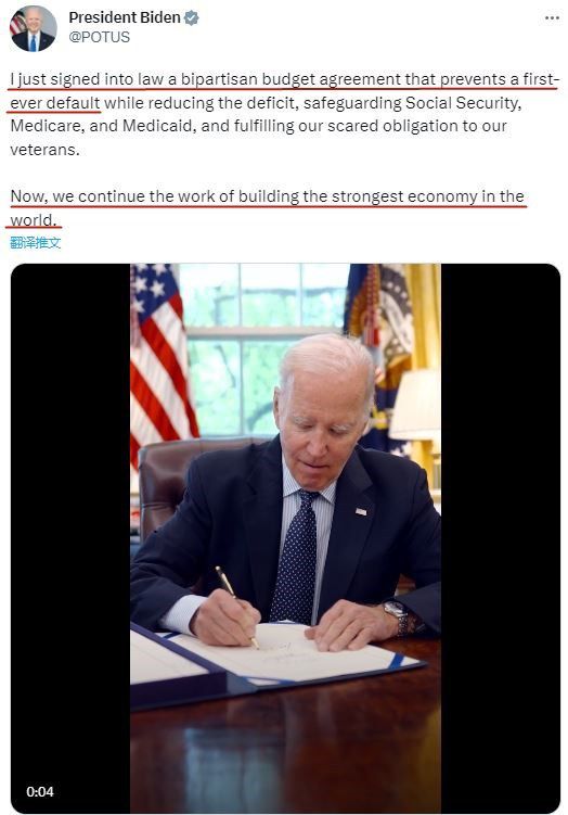 拜登當(dāng)時(shí)在社交媒體上寫道:“我剛剛簽署了一項(xiàng)兩黨預(yù)算協(xié)議,防止有史以來第一次債務(wù)違約……現(xiàn)在,我們將繼續(xù)建設(shè)世界上最強(qiáng)大的經(jīng)濟(jì)體?!?/p>