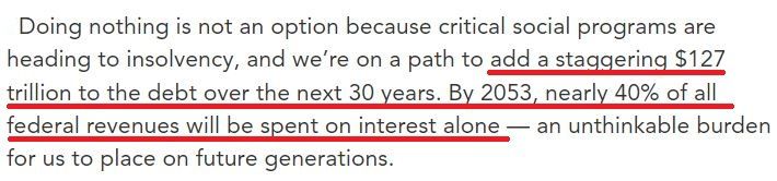 根據(jù)該智庫(kù)的預(yù)測(cè),美國(guó)在未來30年將在現(xiàn)有基礎(chǔ)上再增加127萬億美元債務(wù);到2053年,光是利息成本就要用掉近40%的聯(lián)邦財(cái)政收入。