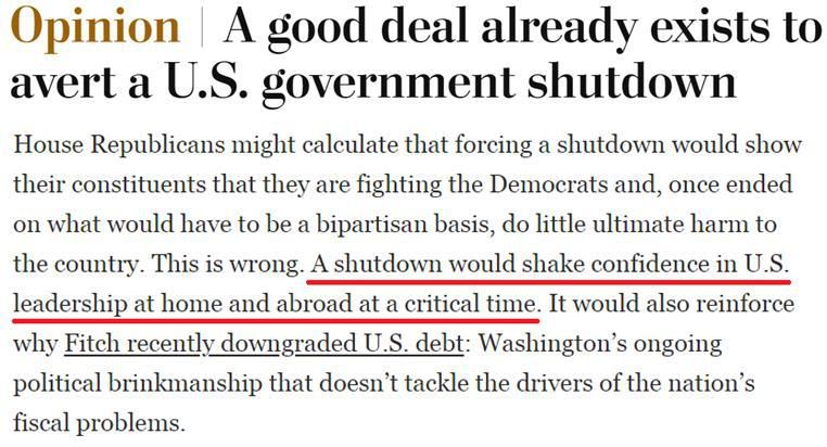 有美媒評(píng)論指出,政府關(guān)門將動(dòng)搖國(guó)內(nèi)外對(duì)美國(guó)領(lǐng)導(dǎo)層的信心,而這也將進(jìn)一步坐實(shí)國(guó)際評(píng)級(jí)機(jī)構(gòu)對(duì)美國(guó)信用“降級(jí)”的原因:華盛頓持續(xù)的政治脅迫政策無法解決日益惡化的財(cái)政問題。