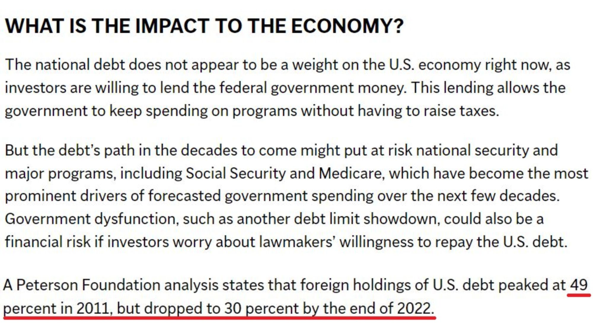美聯(lián)社的報(bào)道指出,正是由于投資者長(zhǎng)期以來愿意借錢給美國(guó)政府,后者才得以在不增加稅收的情況下持續(xù)花錢?!暗磥韼资甑膫鶆?wù)路徑可能會(huì)危及美國(guó)的國(guó)家安全和主要支出項(xiàng)目,包括社會(huì)保障和醫(yī)療保險(xiǎn)”。