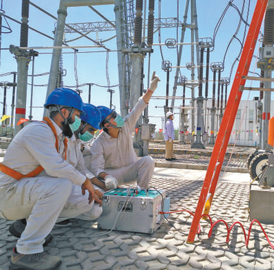 在巴基斯坦默蒂亞里—拉合爾直流輸電項(xiàng)目現(xiàn)場(chǎng),中巴工程師對(duì)設(shè)備開展日常檢修。