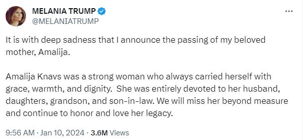 當(dāng)天晚些時(shí)候,特朗普也在社交媒體上發(fā)文稱,“這對(duì)整個(gè)特朗普家族來(lái)說(shuō)是一個(gè)非常悲傷的夜晚!梅拉尼婭偉大而美麗的母親阿瑪利加,剛剛?cè)チ颂炜罩幸粋€(gè)美麗的地方。她是一個(gè)令人難以置信的女性,我們對(duì)她的懷念難以言表!”此外,他還貼出了自己與岳母的合影舊照。