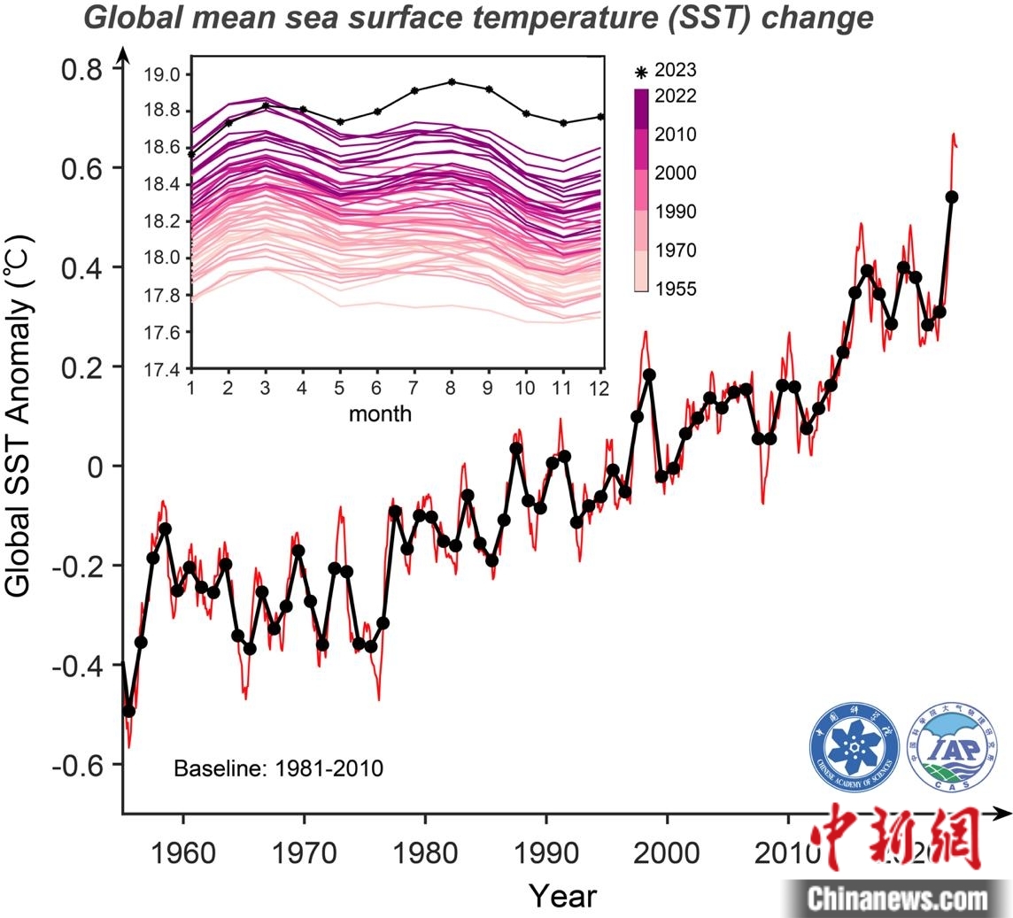 根據(jù)IAP/CAS溫度數(shù)據(jù)產(chǎn)品(1米層)分析的1955年至2023年12月全球平均海表溫度變化。黑線為年均值,紅色為月均值;異常值為相對(duì)于1981-2010年常年值;左上角內(nèi)框?yàn)楹1頊囟鹊募竟?jié)變化。中國(guó)科學(xué)院大氣物理研究所/供圖
