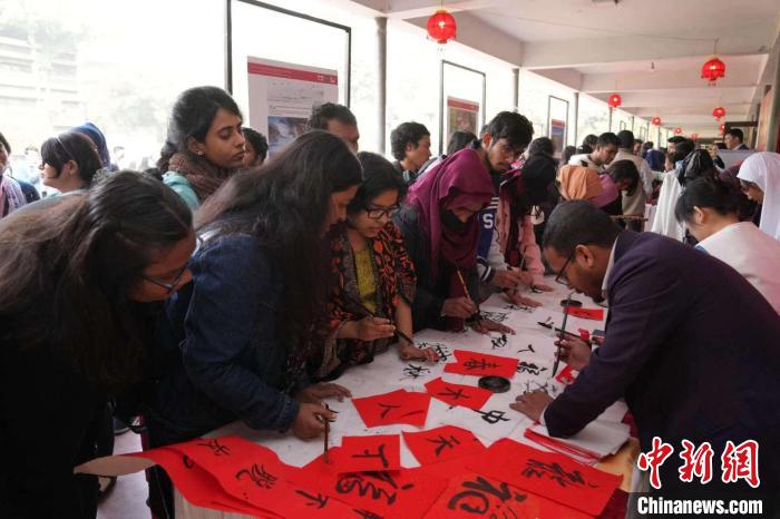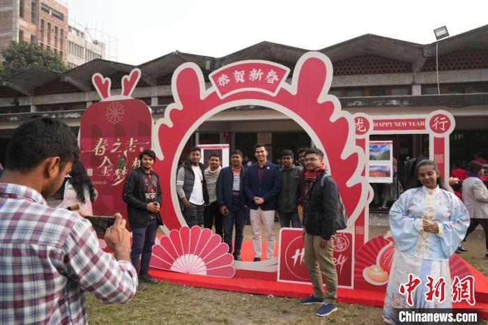 此次活動(dòng),受到達(dá)卡大學(xué)師生及當(dāng)?shù)孛癖姷臍g迎。數(shù)百份“?!弊?、春聯(lián)、年畫、中國(guó)結(jié)、燈籠,營(yíng)造濃濃的節(jié)日氛圍;近3000人次學(xué)生體驗(yàn)寫福字、穿漢服等傳統(tǒng)文化;精彩的舞獅表演贏得陣陣喝彩;“恭賀新春”打卡區(qū)更是排起長(zhǎng)龍……