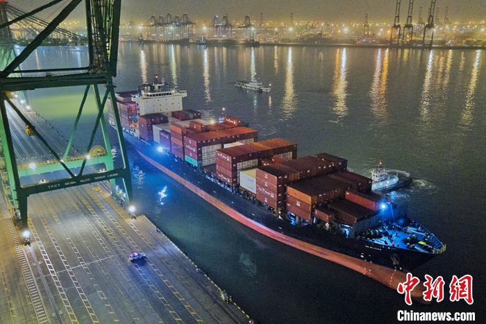 1月16日晚,裝載著2500余噸智利車?yán)遄拥拇笮图b箱班輪“巴赫”號(hào),順利抵達(dá)天津港太平洋國(guó)際集裝箱碼頭,標(biāo)志著天津港與南美洲直航的首條“車?yán)遄涌炀€”正式開(kāi)通?!败?yán)遄涌炀€”始發(fā)于智利圣安東尼奧港,直抵天津港。未來(lái)一周,還將有2艘次智利車?yán)遄迂洿诌_(dá)天津港,累計(jì)8300噸車?yán)遄蛹捌渌厦乐蕻a(chǎn)品從天津港上岸。(無(wú)人機(jī)照片) 中新社記者 佟郁 攝