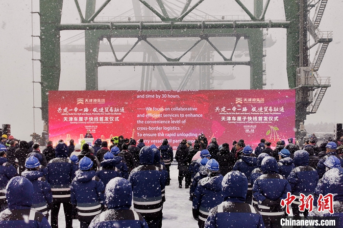 1月17日,天津車?yán)遄涌炀€首發(fā)儀式在天津港太平洋國(guó)際集裝箱碼頭舉行?!败?yán)遄涌炀€”始發(fā)于智利圣安東尼奧港,直抵天津港。未來(lái)一周,還將有2艘次智利車?yán)遄迂洿诌_(dá)天津港,累計(jì)8300噸車?yán)遄蛹捌渌厦乐蕻a(chǎn)品從天津港上岸。 中新社記者 佟郁 攝