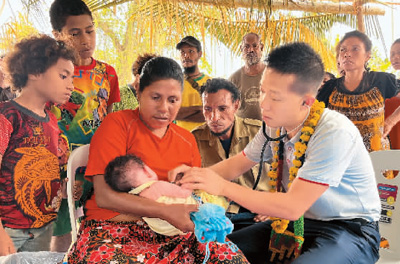 在巴布亞新幾內(nèi)亞中央省村莊里,第十二批援巴新中國醫(yī)療隊副隊長、新生兒科副主任醫(yī)師劉振球為當?shù)貗雰郝犜\檢查。