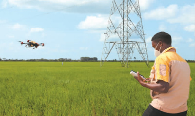 在烏干達卡隆古區(qū)盧卡亞鎮(zhèn)中億農(nóng)業(yè)園,作業(yè)員赫伯特·阿加巴操控植保無人機噴灑農(nóng)藥。