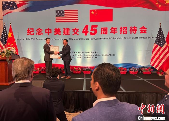 當(dāng)?shù)貢r(shí)間1月26日,中國(guó)駐洛杉磯總領(lǐng)事館舉辦紀(jì)念中美建交45周年招待會(huì)?!≈行律缬浾?張朔 攝