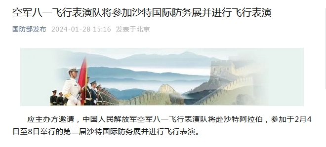 中新網(wǎng)1月28日電 據(jù)國防部官方微信消息,應(yīng)主辦方邀請(qǐng),中國人民解放軍空軍八一飛行表演隊(duì)將赴沙特阿拉伯,參加于2月4日至8日舉行的第二屆沙特國際防務(wù)展并進(jìn)行飛行表演。