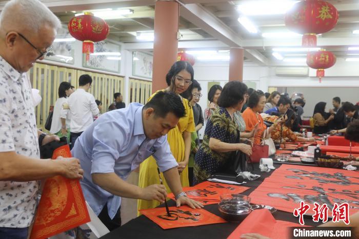 活動現(xiàn)場張燈結(jié)彩,喜氣洋洋。印尼書畫學(xué)院董事長胡素丹率先執(zhí)筆揮墨,筆翰如流寫下“龍行天下”四個字,表達她對新年的期待。這場闊別已久的線下?lián)]春活動也由此拉開帷幕。到場的書法愛好者,無論男女老少,都執(zhí)筆、揮春、寫福,用筆墨丹青表達新春祝福。