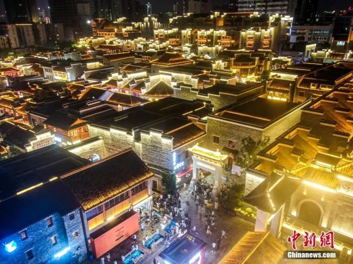 航拍江西南昌萬(wàn)壽宮歷史文化街區(qū),不少游客在古色古香、燈火璀璨的街區(qū)中觀(guān)光游玩。劉力鑫 攝