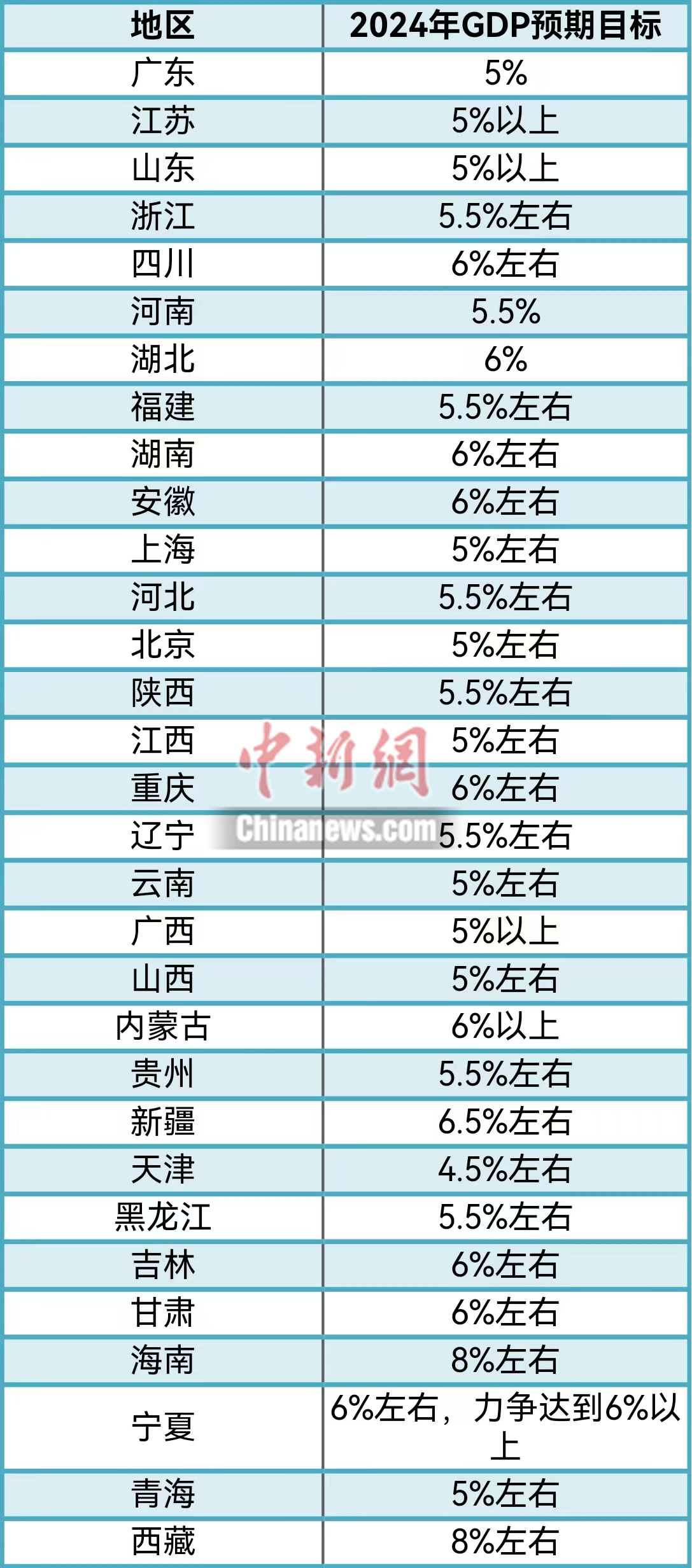 從各個省份敲定的新年GDP目標(biāo)來看,絕大多數(shù)省份不低于5%,其中,海南、西藏均將2024年增速目標(biāo)設(shè)為8%左右,為全國最高。