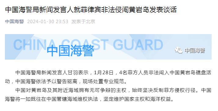 中國(guó)海警局新聞發(fā)言人就菲律賓非法侵闖黃巖島發(fā)表談話