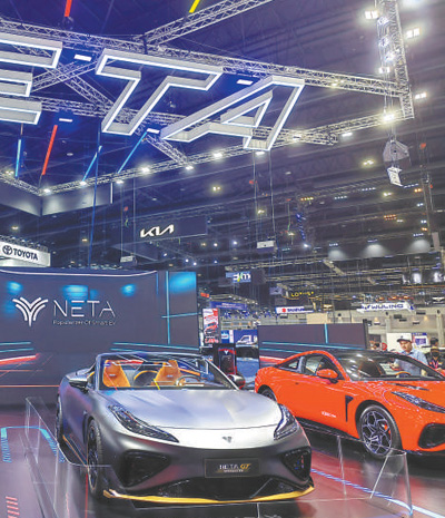 在2023年舉辦的第四十屆泰國國際汽車博覽會(huì)上,中國品牌新能源汽車廣受關(guān)注。圖為哪吒汽車展區(qū)。