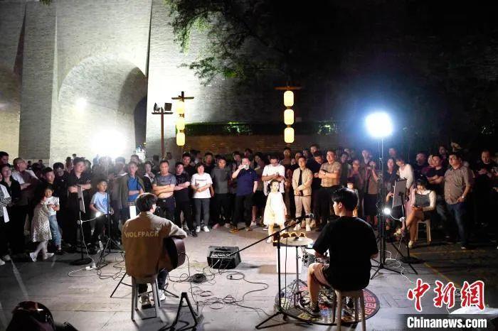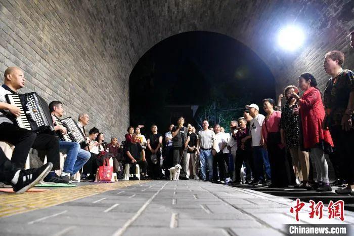 圖為民眾在永寧門下歌唱。 張遠 攝