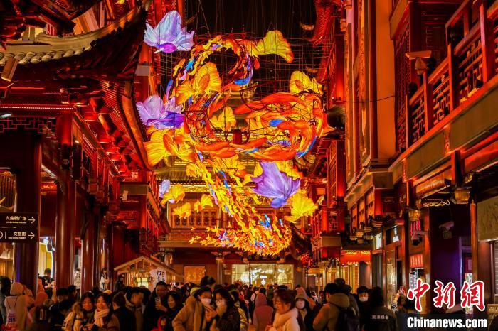 上海豫園商城凝暉路上的“一夜魚龍舞”主題燈組。(復(fù)星國際供圖)
