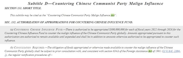 具體內(nèi)容為:“授權(quán)在2022年至2026年的每個(gè)財(cái)政年度,為‘對(duì)抗中國(guó)影響力基金’撥款3億美元,以對(duì)抗中國(guó)共產(chǎn)黨在全球的惡意影響?!?/p>