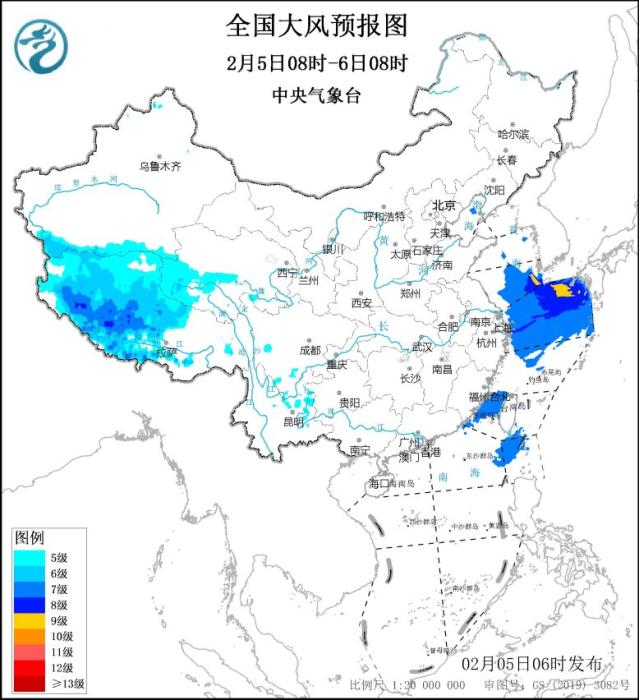 中央氣象臺2月5日06時繼續(xù)發(fā)布大風(fēng)藍(lán)色預(yù)警:預(yù)計,2月5日08時至6日08時,西藏中西部、青海西南部等地將有5~7級、陣風(fēng)8級的大風(fēng);黃海南部海域、東海大部海域、臺灣海峽、巴士海峽將有7~8級、陣風(fēng)9級的大風(fēng),其中黃海東南部、東海東北部的部分海域風(fēng)力可達(dá)9級、陣風(fēng)10級。