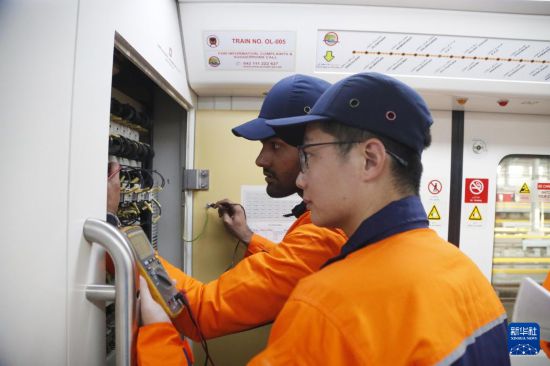 2月1日,在巴基斯坦拉合爾,中巴方員工在檢修橙線地鐵列車。新華社發(fā)(艾哈邁德·卡邁勒攝)