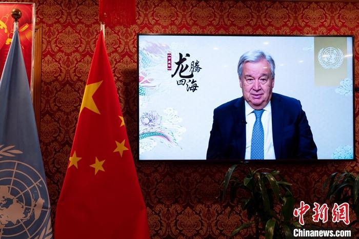 當?shù)貢r間2月6日,聯(lián)合國秘書長古特雷斯通過視頻發(fā)表新春致辭,向中國人民和全球華人致以農(nóng)歷甲辰龍年的祝福和問候。圖為中國常駐聯(lián)合國代表團紐約駐地的屏幕播放致辭。 中新社記者 王帆 攝