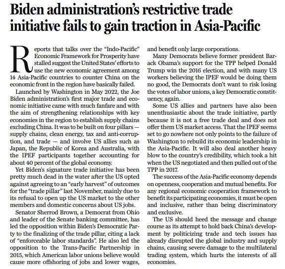 然而,去年11月,受到美國方面態(tài)度的影響,框架“四大支柱”中的“貿(mào)易支柱”談判未能收獲“早期成果”。這主要是因?yàn)槊绹芙^向其他成員國開放市場,且其國內(nèi)擔(dān)憂協(xié)定可能會(huì)給就業(yè)帶來影響。由此,IPEF基本上已沒有前途可言。