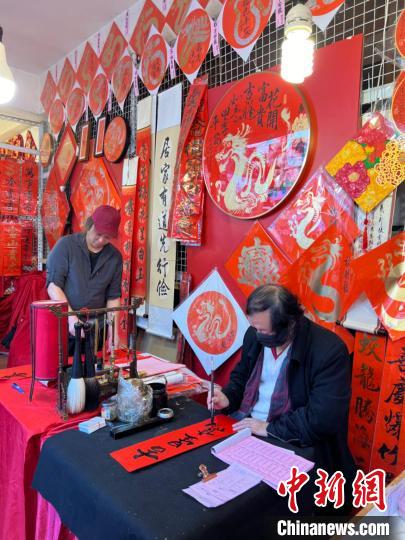 2月4日正逢立春,臺(tái)北迪化街上的商家正在書(shū)寫(xiě)龍年春聯(lián)。中新社記者 路梅 攝