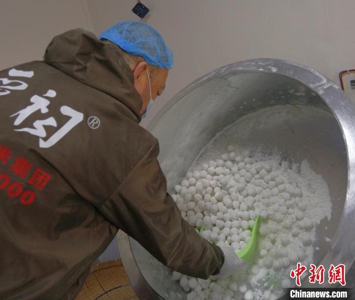 7臺(tái)電動(dòng)滾筒轟鳴作響,圓滾滾的元宵伴著江米粉一起飛舞——蘸一遍水滾一次,一顆正方體的餡料要經(jīng)過六蘸六滾,方可形成瓷實(shí)的圓球形。如此滾制出的元宵,無論煮或者炸,都軟糯香甜、口感獨(dú)特,不少老太原人要的就是這一口“老味道”。