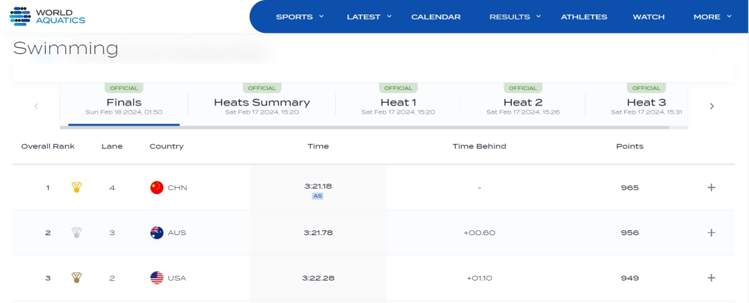 在預(yù)賽中,中國(guó)隊(duì)便狀態(tài)不俗,游出了3分24秒47的成績(jī),打破了由日本隊(duì)保持的亞洲紀(jì)錄(3分24秒67),排名第一晉級(jí)決賽。