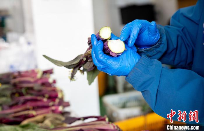每天清早,趁露水未干,菜農(nóng)便穿梭于田壟間,長勢繁茂的菜薹如女子手腕粗細,葉片紅得發(fā)紫。菜農(nóng)手握掐刀,瞄準基部輕輕一掐,汁水四溢,拭塵土、扒外皮,即可生食。若是經(jīng)歷寒風雪霜,更是甘甜。