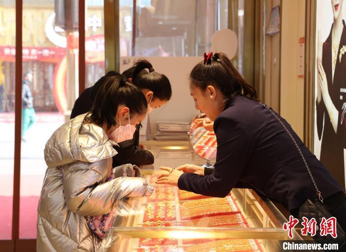 2024年2月,市民在商場(chǎng)內(nèi)選購(gòu)黃金飾品?!≈行律缬浾?于晶 攝