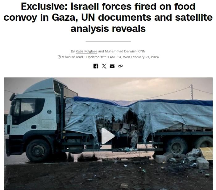 CNN:以軍曾向聯(lián)合國(guó)加沙運(yùn)糧車隊(duì)開火 大量物資被毀