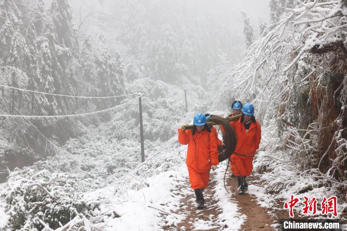 2月8日,國網(wǎng)浙江電力援湘搶險隊員前往平江縣開展搶修作業(yè),扛運搶修物資?!±盥勎?攝