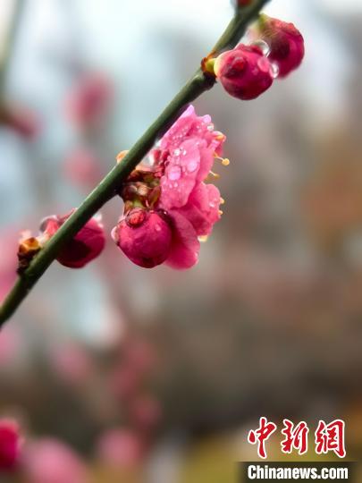 晶瑩的水滴為燦爛的梅花中增加了點(diǎn)點(diǎn)浪漫。(中新網(wǎng)記者陳靜攝)